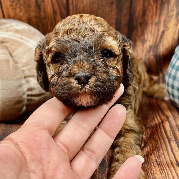 Lilo is a gorgeous little gal. She has a dark red coat with black markings. She is adorable. Can't wait to watch her grow. She will be around 12-15 pounds.